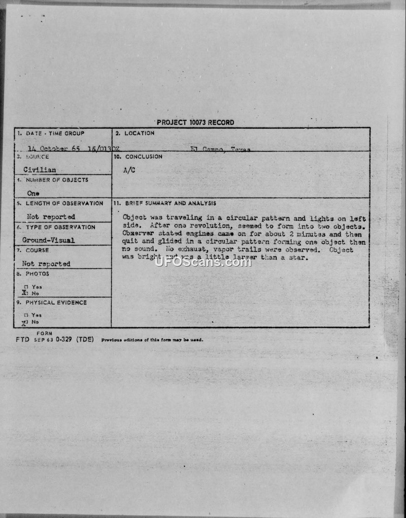 Project 10073 Record — El Campo, Texas, 14 October 1965