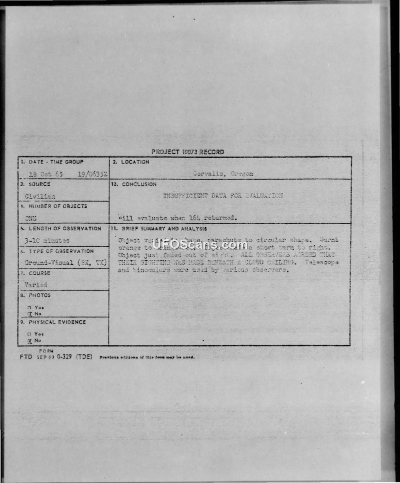 Project 10073 Record: Sighting in Corvallis, Oregon, 18 October 1965