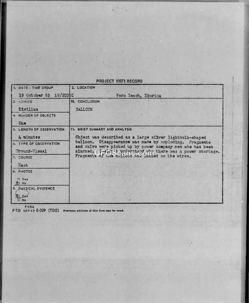 A sighting of a silver, lightbulb-shaped object in Vero Beach, Florida, on October 19, 1965, was identified by the Air Force as a meteorological balloon. The balloon was likely associated with Gemini 6 mission preparations and caused a local power disruption after exploding.