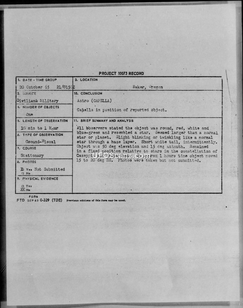A sighting of a stationary, multi-colored object near Baker, Oregon, on 20 October 1965 was investigated by the Air Force. The object was officially identified as the star Capella, with photographic evidence deemed inconclusive due to poor quality and potential double-exposure.