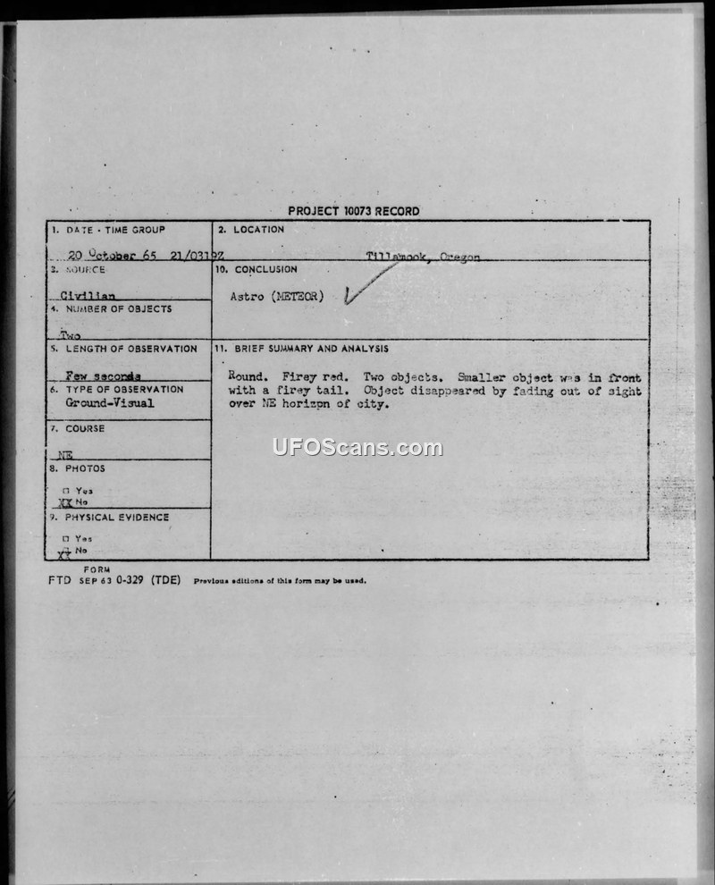 A report of two firey red objects observed near Tillamook, Oregon, on October 20, 1965. The Air Force officially classified the event as a meteor sighting.