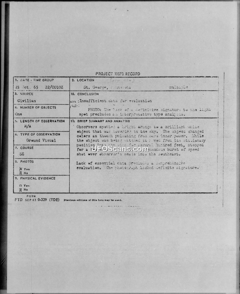 A civilian reported a UFO sighting in Minnesota on 21 October 1965, providing a photograph for military analysis. The Foreign Technology Division concluded the evidence was insufficient for evaluation, noting the provided negative appeared to be a copy.