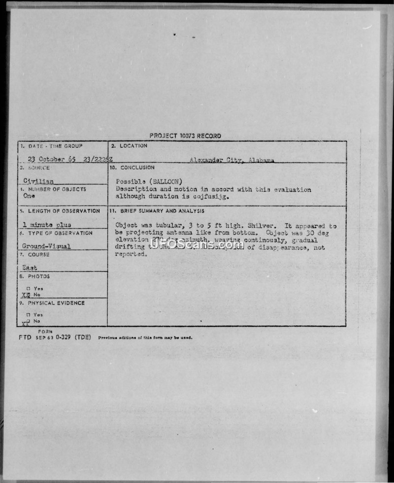 Project 10073 Record — Alexander City, Alabama, 23 October 1965