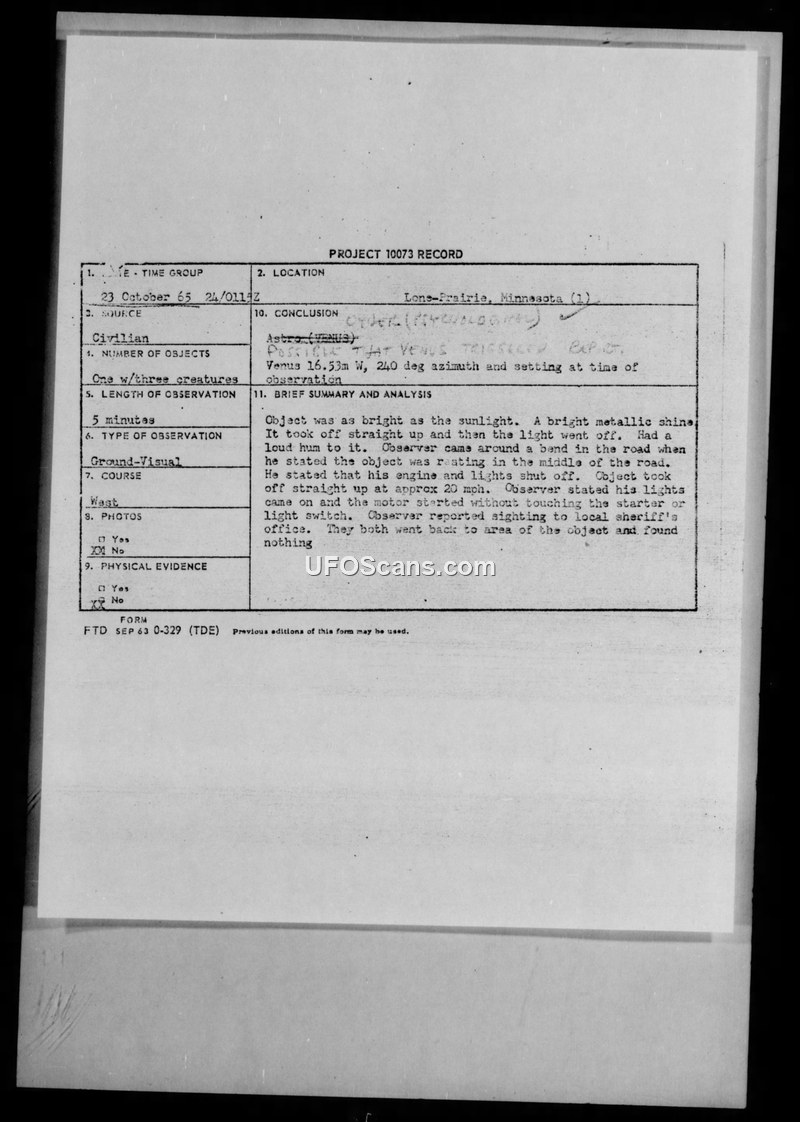 Project 10073 Record: Sighting Report - Long Prairie, Minnesota, 23 October 1965