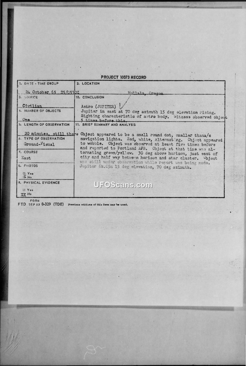 Project 10073 Record — Sighting Report, Mollala, Oregon, 24 October 1965