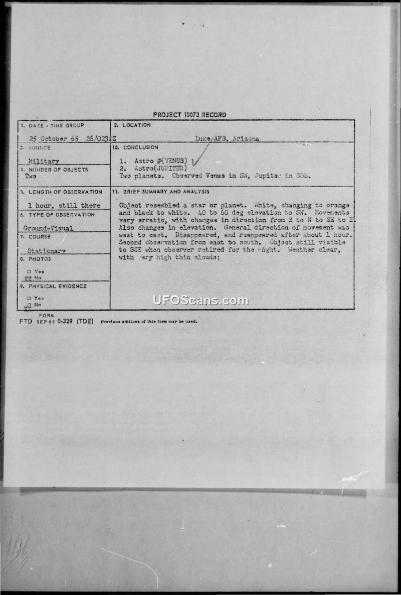 This document is a Project 10073 record and an associated Air Force incoming message detailing a UFO sighting reported on 25 October 1965, approximately 9 miles southeast of Luke Air Force Base in Arizona. The observer, who admitted to having no formal knowledge of astronomy or meteorology, reported seeing an object that resembled a star or planet. The object was described as white, changing to orange and black, and then back to white. Its movement was characterized as very erratic, with shifts in direction from south to north, southeast, and east, as well as changes in elevation. The observer reported the object's size as comparable to a dime and noted that it appeared to move generally from west to east. The sighting occurred in two phases: an initial one-hour observation, followed by a period where the object disappeared, only to reappear for another hour. The observer used 8x50 binoculars during the event. Weather conditions were reported as clear with very high, thin clouds and good visibility. The official conclusion reached by the Air Force was that the objects observed were the planets Venus and Jupiter. However, the report includes a note from Major Orval M. Bond, a meteorologist assigned to PHADS, who stated that he would have classified the object as a star if not for its peculiar, erratic movement. The report was processed through various Air Force channels, including the Foreign Technology Division at Wright-Patterson Air Force Base.