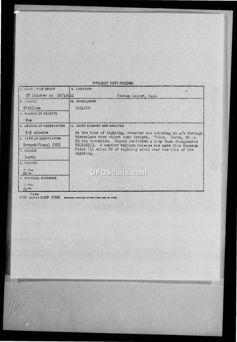 On October 27, 1965, at 1945Z, a civilian witness named Brent Redstone, a 15-year-old student residing in Newton Center, Massachusetts, observed an unidentified object. The witness was using 6x30 binoculars to watch an aircraft when he spotted the object. He described the object as white, saucer-shaped, and appearing the size of a pencil eraser at an elevation of 50 to 60 degrees. The object was observed moving North, performed a loop, and then disappeared. The total duration of the observation was between two and three minutes. The report was processed by the 551st Airborne Early Warning and Control Wing at Otis Air Force Base. Following an investigation, the Wing Intelligence Officer determined that the probable cause of the sighting was a weather balloon. This conclusion was supported by the fact that a weather balloon had been released from Hanscom Field in Bedford, Massachusetts—located approximately 11 miles northwest of the sighting area—at a time consistent with the observation. The report notes that weather conditions at the time were clear with unlimited visibility.