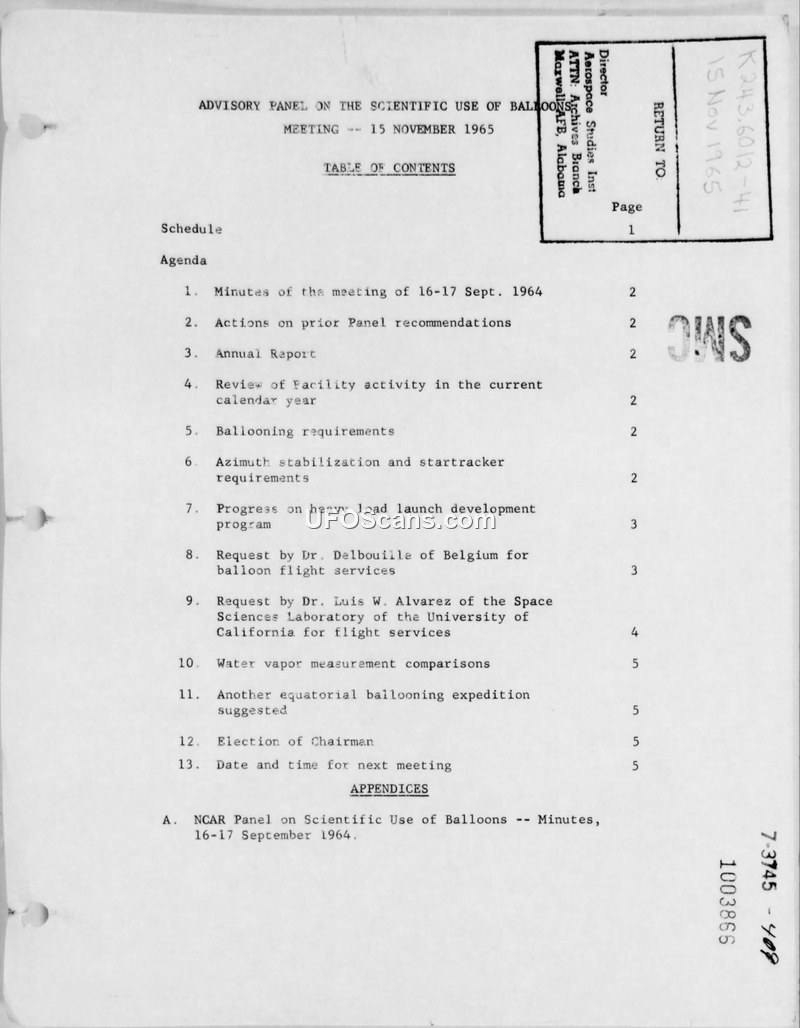This document contains the agenda and minutes for the meeting of the Advisory Panel on the Scientific Use of Balloons, held on 15 November 1965. The panel, which included prominent scientists such as Allen Hynek and Edward Ney, met to discuss the ongoing activities of the National Center for Atmospheric Research (NCAR) Scientific Balloon Facility. Key agenda items included the review of previous panel recommendations, the annual report of the facility, and the status of various ballooning projects. A significant portion of the meeting was dedicated to evaluating new requests for ballooning services. Specifically, the panel reviewed a proposal from Dr. Luis W. Alvarez of the University of California for a high-altitude particle physics experiment, which involved the use of superconducting magnets and spark chambers. The panel also discussed a request from Dr. L. Delbouille of the Institut d'Astrophysique in Belgium for balloon flight services to study the solar spectrum. The document includes detailed technical reports and proposals related to these experiments, such as the design of balloon-borne equipment, the use of Cerenkov triggers, and the logistical challenges of launching heavy payloads. Furthermore, the panel addressed the IQSY expedition in India and considered future possibilities for balloon-borne observations during the 1966 total solar eclipse in South America. The document also contains correspondence between NCAR staff and researchers, providing insight into the collaborative nature of these scientific endeavors and the administrative processes involved in managing large-scale, high-altitude research programs.