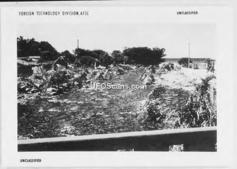 The document consists of a single photograph labeled as originating from the Foreign Technology Division, AFSC. The image depicts a landscape scene featuring a stream or riverbed surrounded by vegetation and trees, with a structure visible in the background. The document is marked as unclassified.