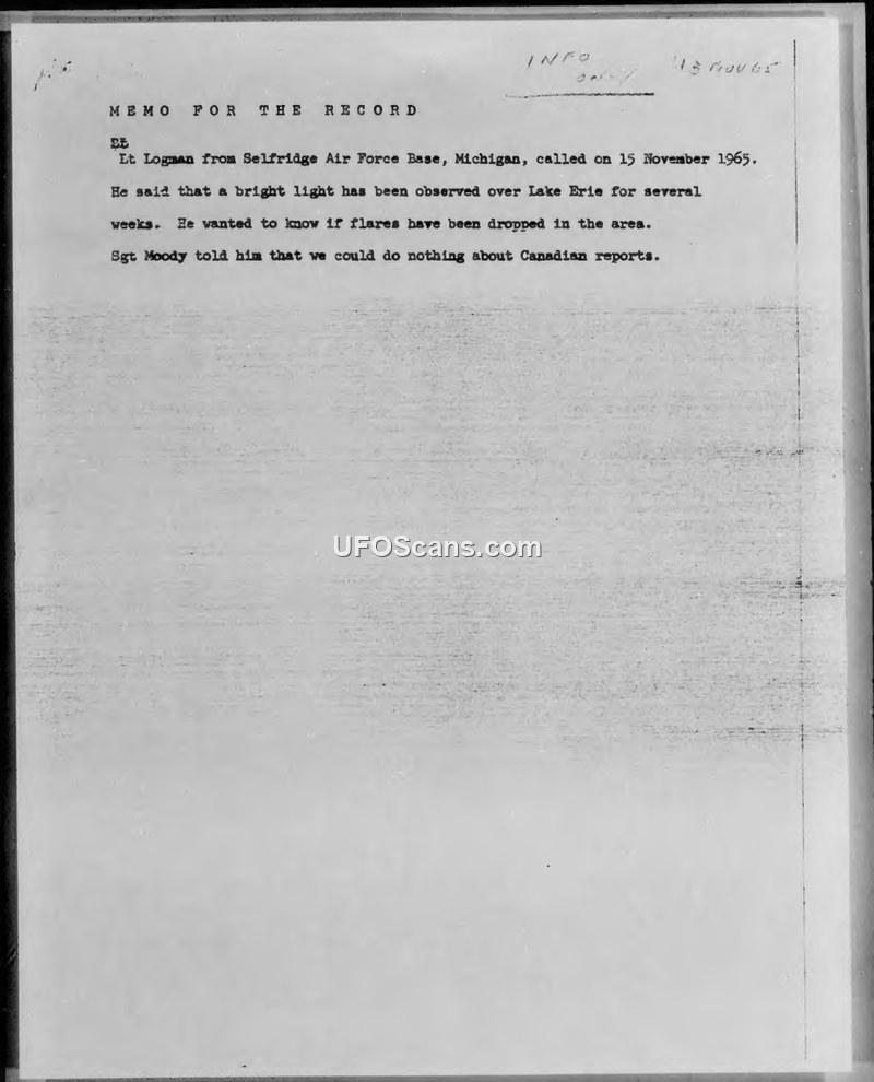 US Air Force records from November 1965 regarding reports of a bright light over Lake Erie. The RCAF reportedly investigated the sightings and concluded a plane had crashed in the area.