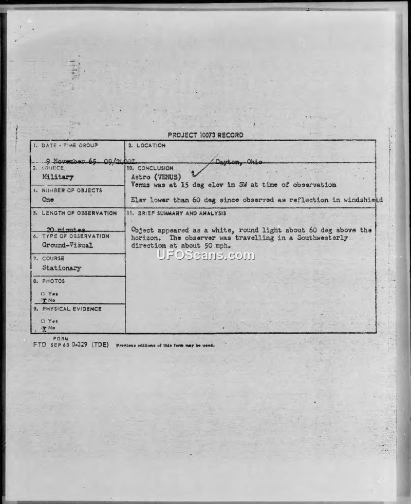 Project 10073 Record: Sighting Report - Dayton, Ohio, 9 November 1965