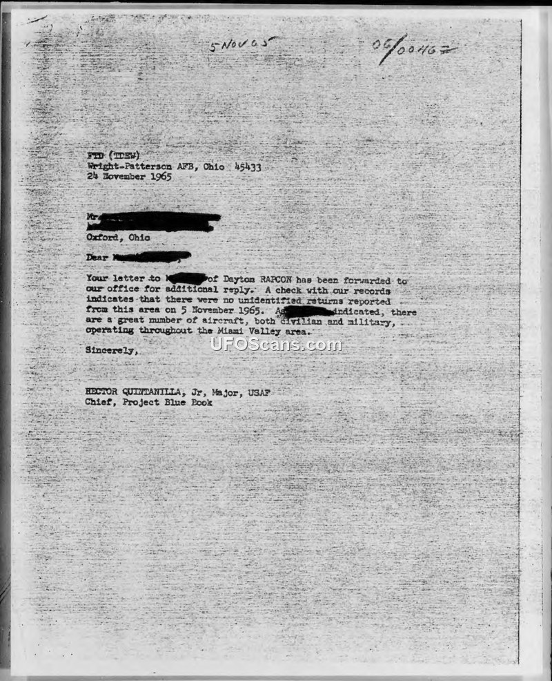 This document collection consists of correspondence regarding a UFO sighting reported by a Miami University student in Oxford, Ohio, on November 5, 1965. The witness, while walking on College Avenue, observed three reddish-white objects moving in a southwestern direction in a perfect formation at approximately 7:46 P.M. The witness noted that the objects moved at the pace of an airplane but made no sound, and appeared to be about 600 feet above the ground. The witness initially contacted the Dayton RAPCON radar facility to inquire if the objects had been tracked. In a response dated November 13, 1965, Arvid H. Eide, Chief of Dayton RAPCON, informed the witness that their records showed no unidentified activity in the area that evening, noting that Oxford was outside their standard 33-nautical-mile radar scan range and that the area was subject to significant civilian and military air traffic. Subsequently, Major Hector Quintanilla, Jr., Chief of Project Blue Book at Wright-Patterson AFB, confirmed in a letter dated November 24, 1965, that their records also contained no reports of unidentified returns in the Miami Valley area on the date in question.