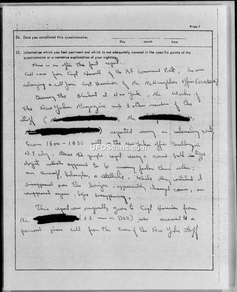 The document explores the possibility that UFOs caused the 1965 Northeastern blackout, citing various witness reports of aerial phenomena and electromagnetic effects.