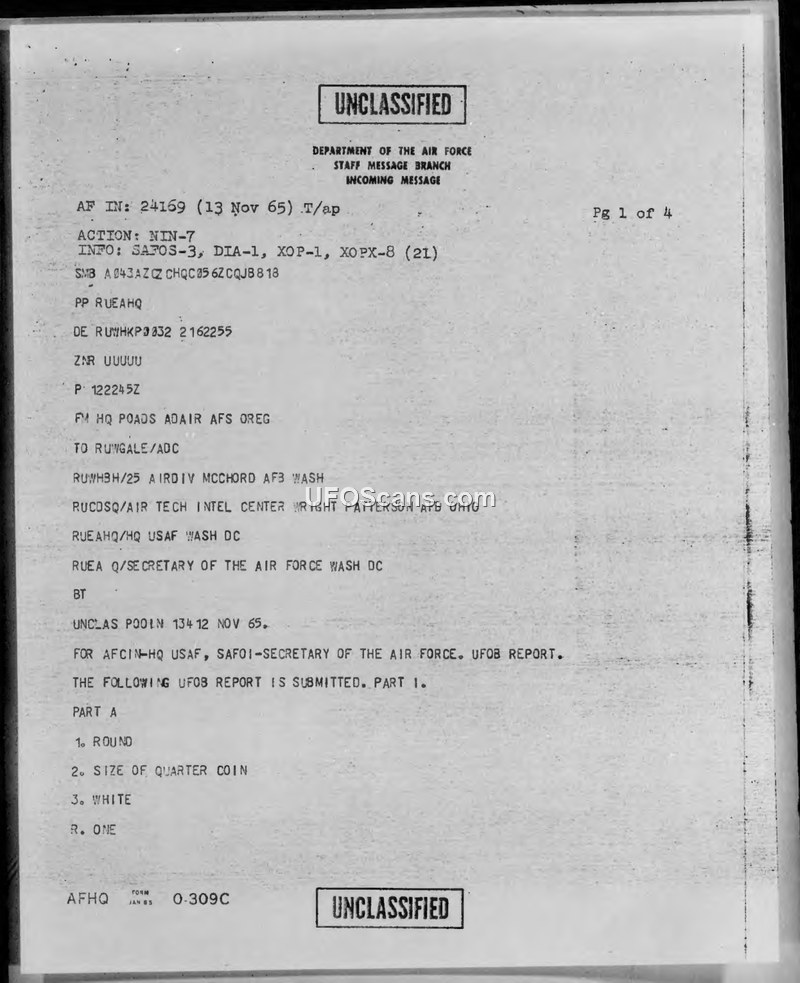 This document is an incoming Air Force staff message dated November 13, 1965, detailing a UFO report (UFOB) from Barview, Oregon. The incident occurred on November 11, 1965, at 0220Z. A 38-year-old grocery store owner reported observing a round, white object, described as being the size of a quarter coin, for a duration of ten minutes. The witness noted the object was moving up and down in a straight flight path and disappeared into clouds in a westerly direction. The witness used a spotting scope to observe the object. The weather at the time was reported as overcast and raining. Major A.F. Shiflett, a staff intelligence officer, investigated the report. He noted that while five F-104 military aircraft were in the area, they were flying at an altitude of at least 6,000 feet and would not have been visible through the overcast conditions. The report concludes that no analysis is offered as to the cause of the sighting and assigns a reliability rating of F-6.
