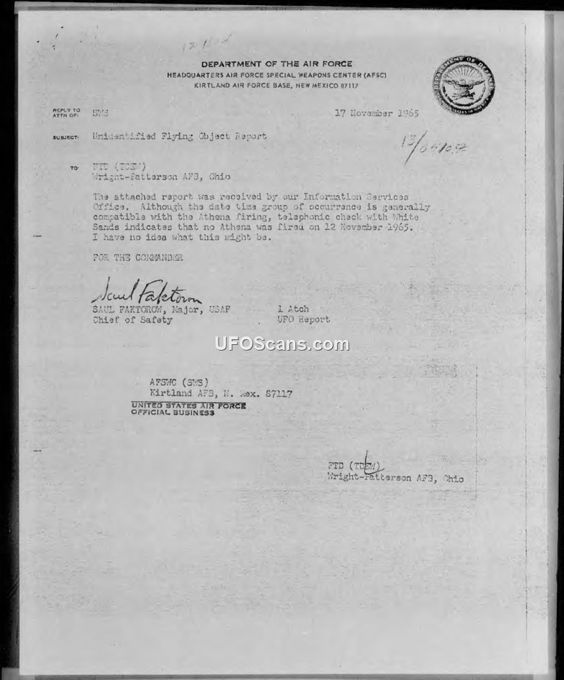 This document consists of a memorandum from the Headquarters Air Force Special Weapons Center (AFSC) at Kirtland Air Force Base, New Mexico, dated 17 November 1965. The memorandum, signed by Major Saul Faktorow, Chief of Safety, forwards an Unidentified Flying Object report to the Foreign Technology Division (FTD) at Wright-Patterson Air Force Base, Ohio. The report details a sighting that occurred on the evening of 12 November 1965, between 9:10 p.m. and 9:30 p.m., in the vicinity of upper Bull Creek, Pecos country, New Mexico. The witness, a contractor, reported observing an egg-shaped object traveling due north from the south. The object was described as dull red in color with a white corona and a triangular tail, similar to a comet. The witness estimated the object was traveling three times faster than a B-52 jet and observed it for approximately four seconds before it disappeared behind the horizon. The witness reported no sound associated with the sighting. Major Faktorow noted that while the time of the occurrence was generally compatible with an Athena missile firing, a telephonic check with White Sands confirmed that no Athena was fired on 12 November 1965. Major Faktorow concluded the memorandum by stating he had no idea what the object might be.