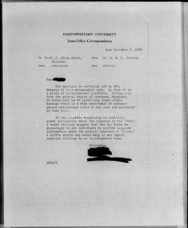 This document contains correspondence and a completed U.S. Air Force Technical Information questionnaire regarding a reported sighting of an unidentified aerial phenomenon in Aberdeen, Maryland. The witness, a 71-year-old male, reported seeing a 'ball of fire' approximately 6 feet in diameter that descended 30 to 40 feet off the road, hit the ground, and burst. The witness subsequently sent a sample of the material he believed was left behind to the American Geological Institute. The material was forwarded to Dr. E. H. T. Whitten at Northwestern University for analysis. Dr. Whitten concluded in a memorandum to Professor J. Allen Hynek that the specimen was not a UFO, but rather a piece of metamorphosed quartzite of likely local origin. Dr. Whitten noted that the information provided by the witness regarding the location of the find was 'scant' and recommended that the Air Force require informants to provide more precise location data, such as sketch maps, to assist investigation teams. The document also includes a letter from Major Hector Quintanilla, Jr., Chief of Project Blue Book, dated June 13, 1966, informing the witness that his initial report was insufficient for evaluation and requesting he complete the attached FTD Form 164.