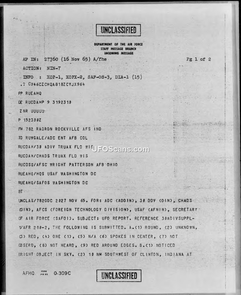 A police officer in Clinton, Indiana, reported observing a round, red, spoked object in the sky for 10 minutes on 15 November 1965. The Air Force recorded the sighting but reached no conclusions based on the preliminary evidence.