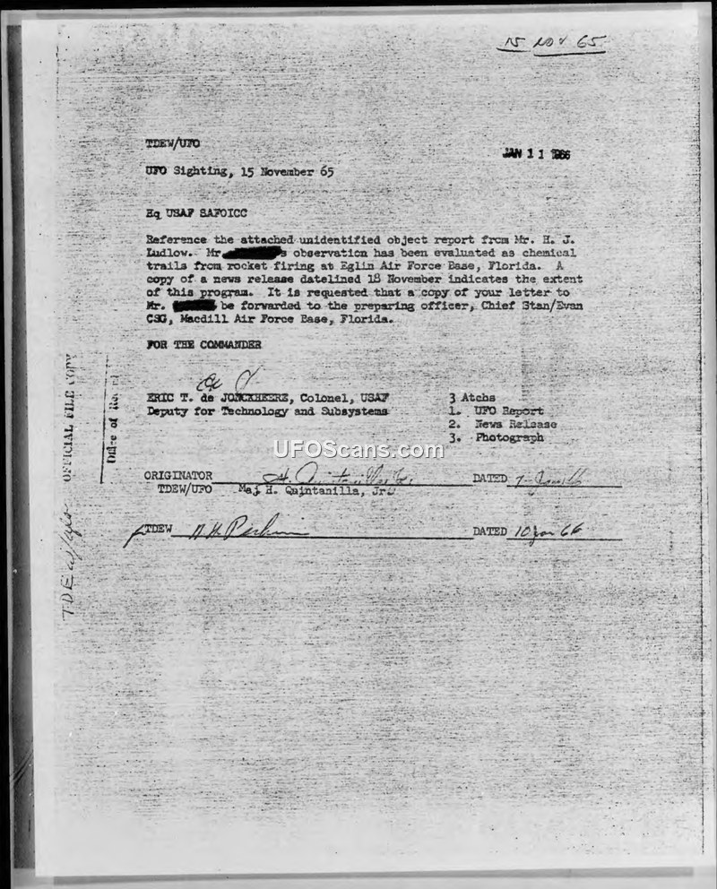 This document consists of a series of official Air Force communications regarding a UFO sighting reported by Mr. H. J. Ludlow on November 15, 1965, in Dunedin, Florida. Mr. Ludlow, a former Air Force aerial photography sergeant, observed a massive, slow-moving object that appeared blue-white or fluorescent and was shaped like a neon light bulb. His account was corroborated by two housewives who were also present. The object was visible for approximately 15 minutes and moved in a slow, horizontal path to the north before disappearing behind thin clouds. The Air Force investigation, conducted by the Chief of Stan/Evan at Macdill Air Force Base, noted that while a weather balloon was released from Tampa International Airport at 2324Z, its path and physical characteristics did not align with the object reported by the witnesses. The investigators concluded that the witnesses appeared reliable and that the object was not a meteorite due to its slow, steady movement. The document also includes a news release from the Air Proving Ground Center at Eglin Air Force Base, which explains that chemical trails observed in the southeastern United States during that period were the result of vertical probe research rockets launched in conjunction with the International Quiet Sun Year (IQSY) program. Despite this context, the specific sighting reported by Mr. Ludlow remained officially unexplained by the reporting officer.