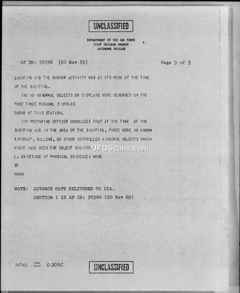 This document consists of a series of incoming messages to the Department of the Air Force regarding a UFO sighting that occurred on November 18, 1965, near Bedford, Virginia. The report details an incident where an unidentified airborne object was observed by three separate police units and two radar operators. The object was described as round, resembling a ball of fire, and varying in brightness and color from white to orange. It was estimated to be at an altitude of 1,000 feet and was observed moving against a 35-knot wind from the west. One witness, Patrolman Keck, reported observing the object for approximately 50 minutes. Despite the visual reports, the 649th Radar Squadron reported no radar contact with the object. Official inquiries with the Washington Air Defense Sector, the FAA, and local weather detachments confirmed that no known aircraft or weather balloons were in the area at the time of the sighting. The reporting officer, 2nd Lieutenant Richard C. Renairi, concluded that there were no known controlled airborne objects that could account for the sighting. It was noted that a series of meteor showers were in progress at the time, though this was not explicitly linked as the cause of the sighting.