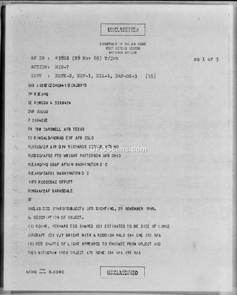 This document is an official Department of the Air Force incoming message, dated November 26, 1965, regarding a UFO sighting reported on November 25, 1965, in Dallas, Texas. A civilian observer reported seeing a round, possibly egg-shaped object in the sky below the moon, estimated to be the size of a large aircraft. The object was described as very bright with a reddish halo, and the witness reported seeing red shafts of light emanating from and then withdrawing back into the object. The object remained stationary for approximately one hour. The observer, located in the southern part of Dallas, was noted as being sincere but inexperienced in providing technical details. Air Force personnel at Carswell AFB investigated the report, noting that a weather balloon had been released from the base at 2313Z on the same day. Although the nearest GCI site at Perrin AFB reported no radar plot, the official conclusion provided by Lt. Col. William E. Ellison of the SAC Command Post at Carswell AFB was that the sighting was likely the weather balloon, despite the witness's inability to identify it as such.