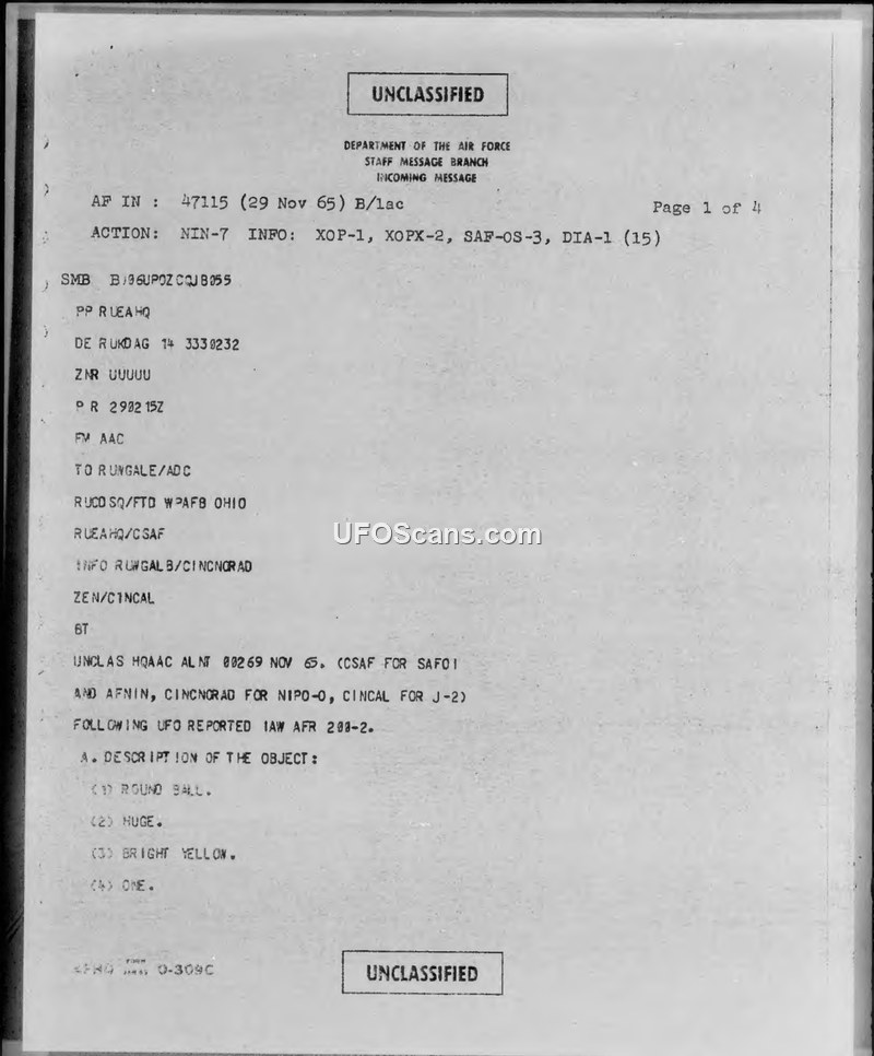 This document is an official Department of the Air Force incoming message, dated 29 November 1965, reporting a UFO sighting that occurred on 26 November 1965. The report details an observation made by a contractor at Mile 94 on the Glenn Highway in Alaska. The witness described seeing a huge, bright yellow, round object against a dark sky at an estimated altitude of 10,000 to 15,000 feet. The object appeared stationary to the observer, who was in a moving vehicle at the time. The witness reported that the object looked like a very large explosion, with burning pieces falling from it, though no sound was heard. The report notes that the Rescue Coordination Center (RCC) confirmed no military or civilian aircraft were known to be operating in the area at the time. Intelligence officers concluded that the evidence was inconclusive for a logical analysis. Efforts to contact a Mr. Walkus on 28 November to obtain further information or physical evidence were unsuccessful, and the military intended to attempt to reestablish contact. The document includes detailed weather and wind conditions at various altitudes for the Gulkana, Alaska area.