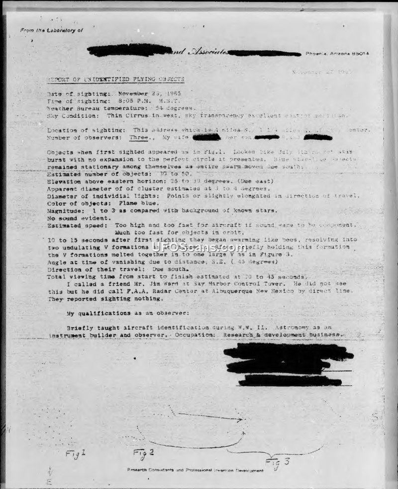 A report detailing a sighting of 30-50 unidentified objects in Arizona on November 25, 1965. The objects exhibited complex swarming behavior and high speeds before disappearing.