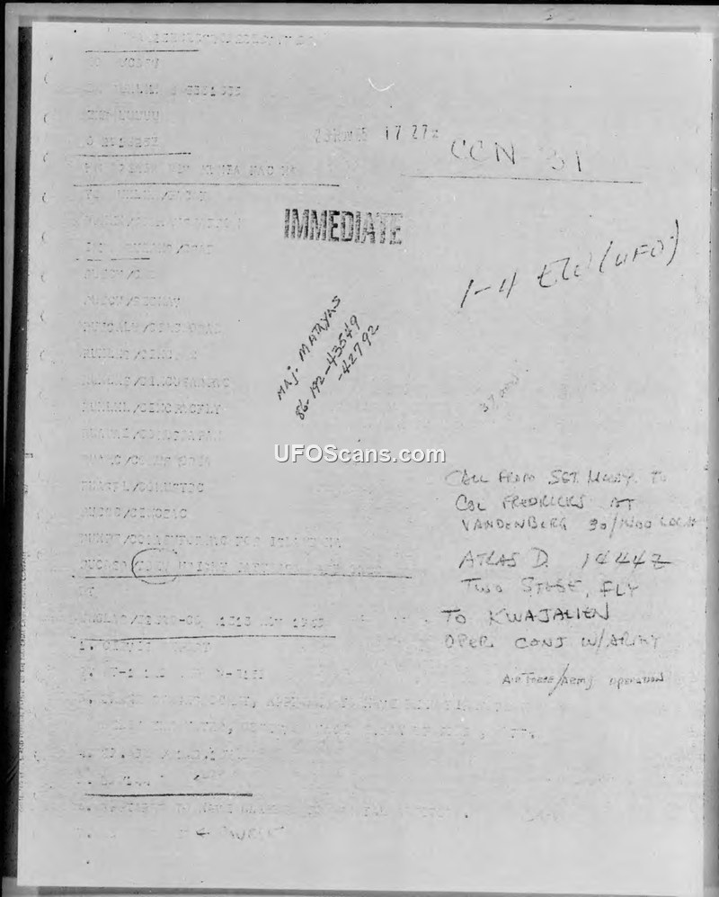 This document consists of a series of military communications regarding a CIRVIS (Communication Instructions for Reporting Vital Intelligence Sightings) report filed on November 29, 1965. The initial report originated from the CGC PONTCHARTRAIN, which observed a bright, starlike object at a high altitude at position 35N 148°. The object was described as being surrounded by an aurora-like light, with a course estimated at 248 degrees true, and it was noted to have risen from 060 degrees true. Following the report, the 32nd Air Division conducted an evaluation. They concluded that the sighting posed no threat and was likely a missile launch from Vandenberg, noting that the time frames and observed phenomena correlated with such an event. Handwritten notes on the document indicate a communication between a Sergeant Mury and a Colonel Fredericks at Vandenberg regarding an Atlas D launch to Kwajalein, further supporting the conclusion that the sighting was a military operation.