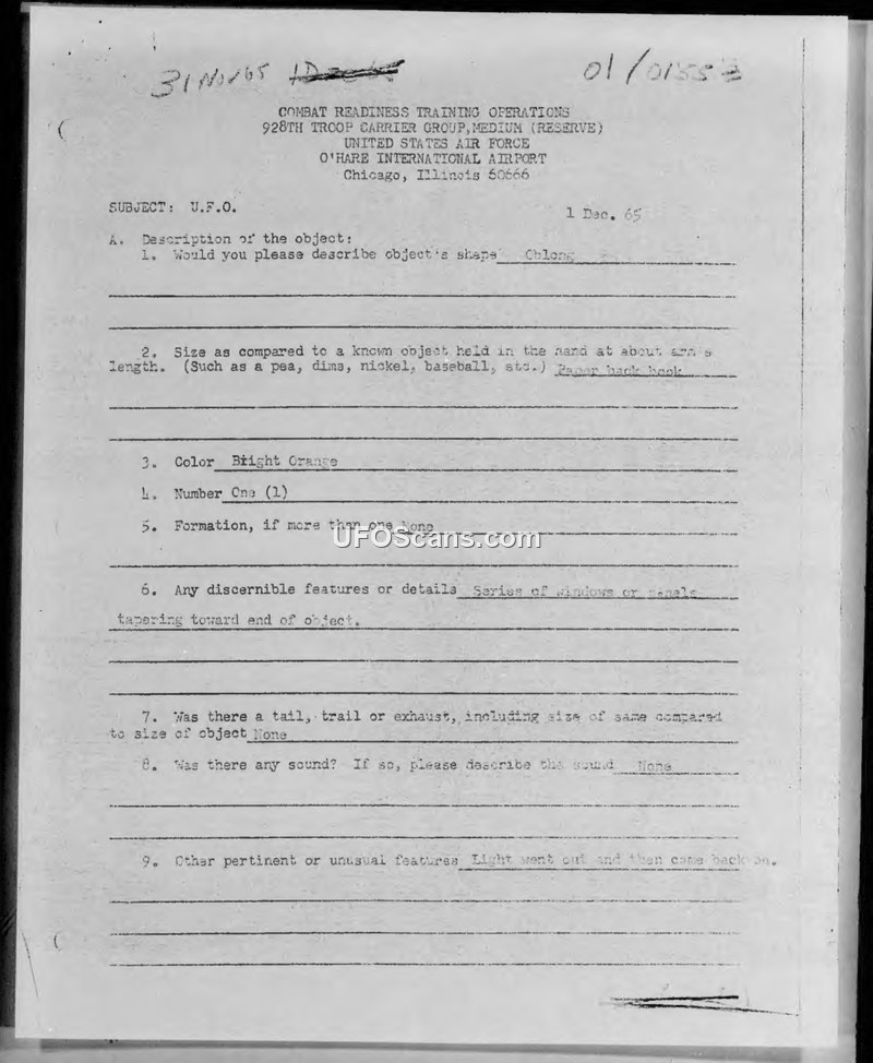 A 22-year-old civilian reported an oblong, bright orange object in Oak Park, Illinois, on 1 December 1965. The investigating official suggested the sighting might be related to aerial night advertising.