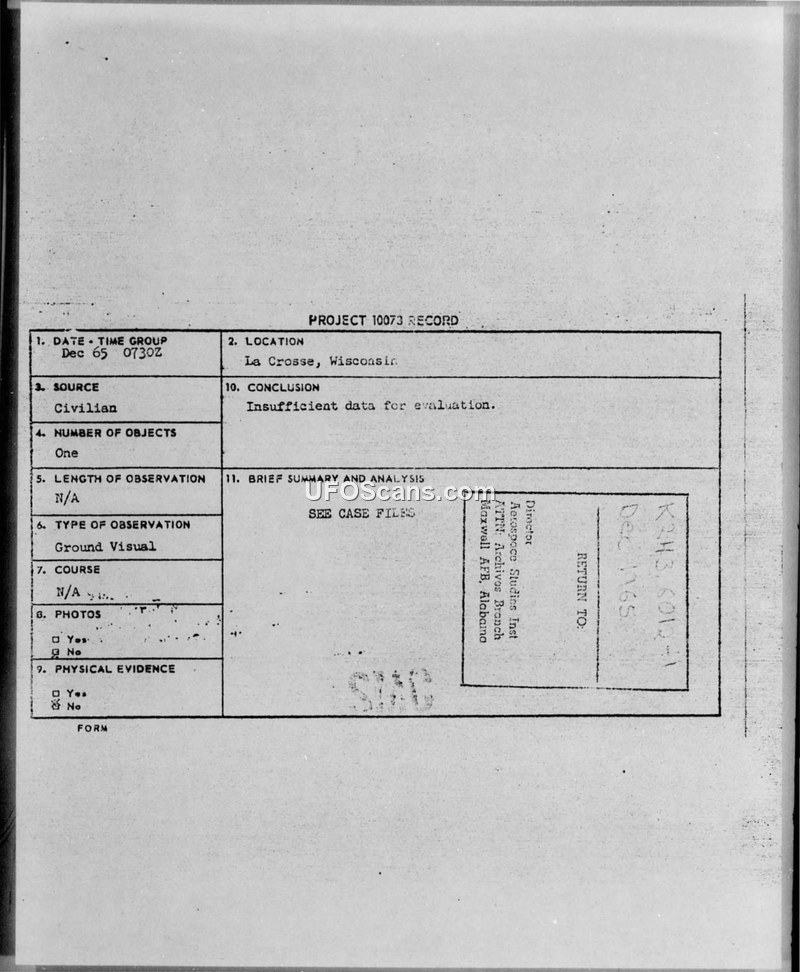A civilian in La Crosse, Wisconsin, reported an unidentified object in December 1965. The Air Force concluded the report contained insufficient data for a formal evaluation.