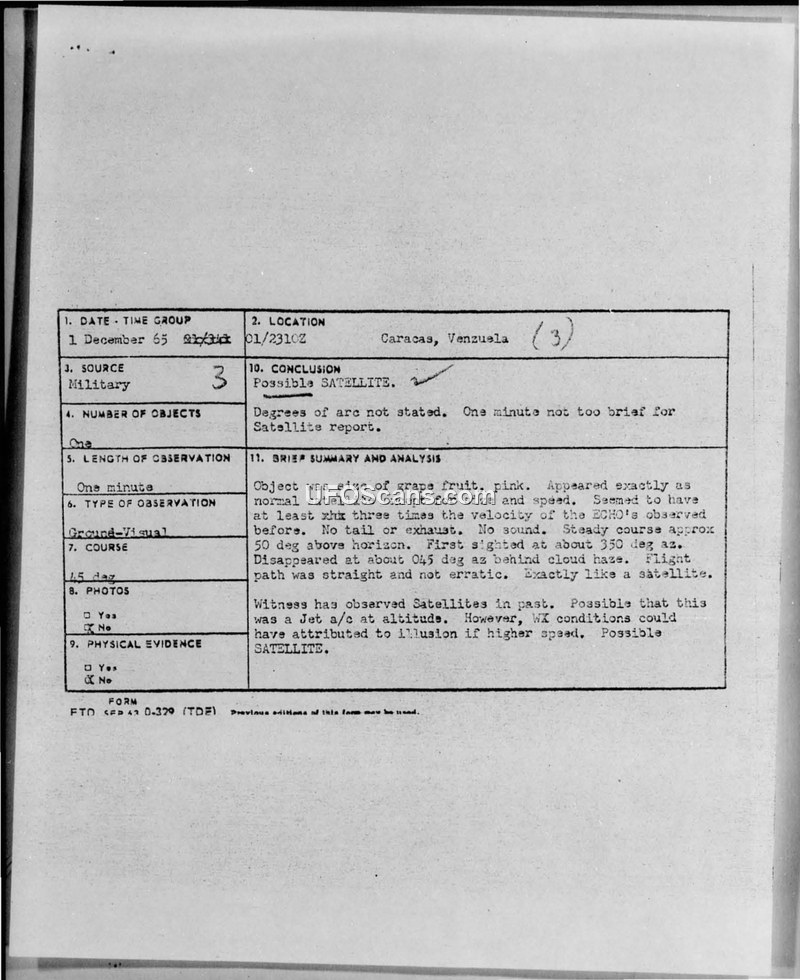 A report of a spherical, pink, grapefruit-sized object sighted in Caracas, Venezuela, on 1 December 1965. The object moved at high speeds, leading to an inconclusive evaluation as a possible satellite or high-altitude jet.