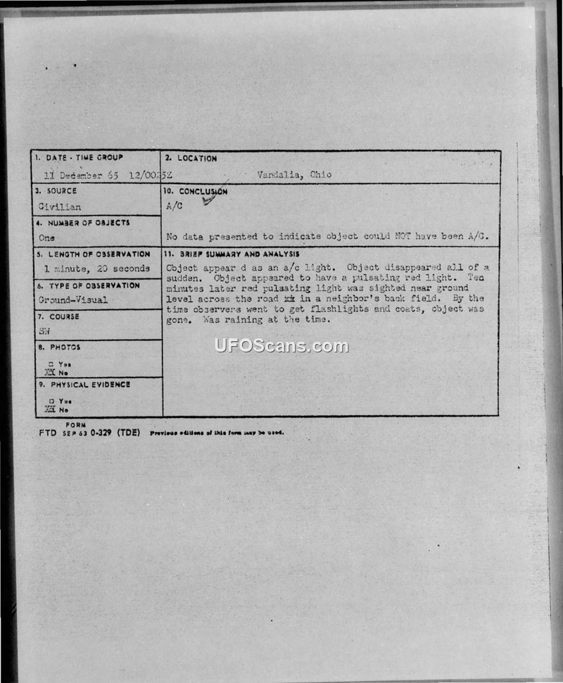 A civilian in Vandalia, Ohio, reported a pulsating red light on December 11, 1965. The Air Force concluded the object could have been an aircraft.
