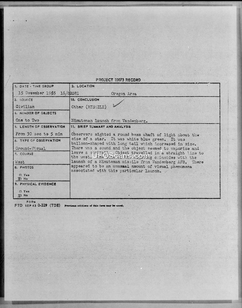 Three observers in Oregon reported a luminous aerial object on December 15, 1965. The Air Force concluded the sighting was caused by a Minuteman missile launch from Vandenberg AFB.