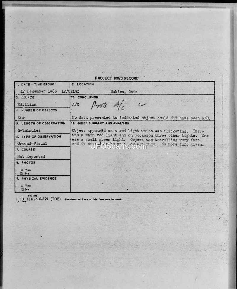 Project 10073 Record — Sabina, Ohio, 17 December 1965