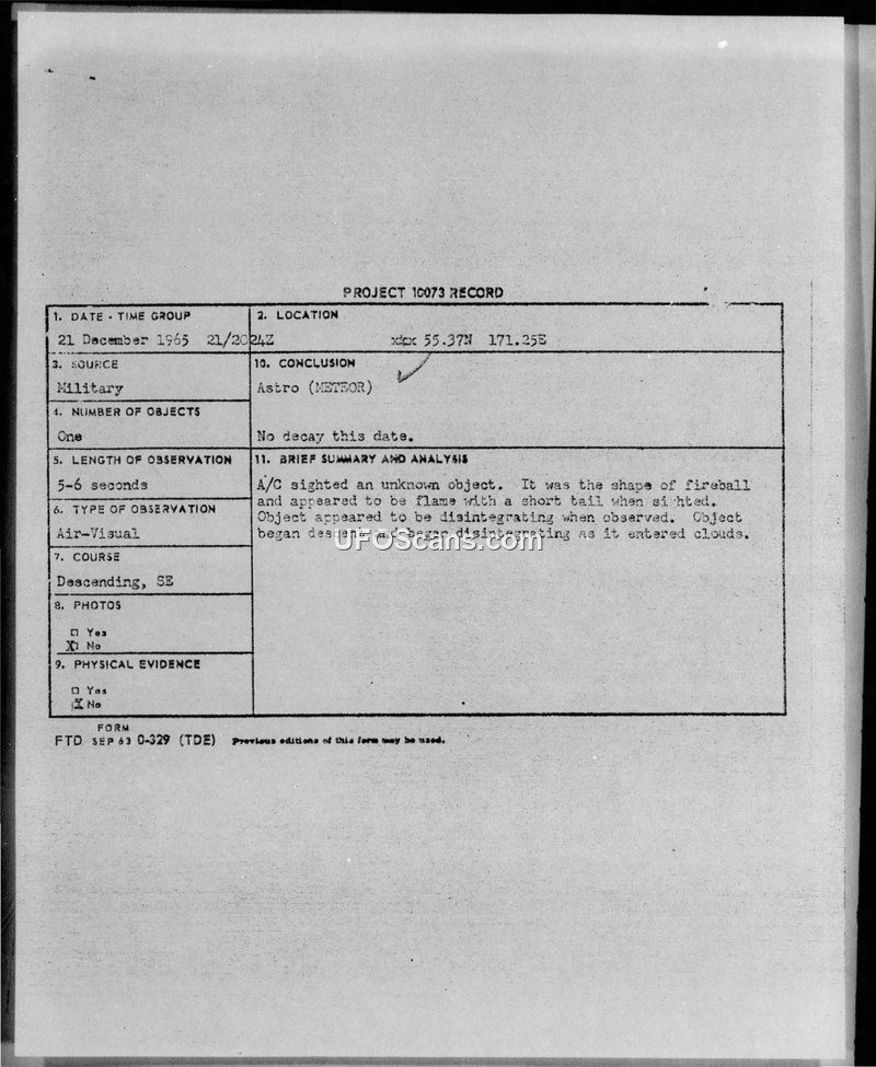 On December 21, 1965, at 2024Z, personnel from CTF 33 observed an unidentified flying object at coordinates 55.37N 171.25E. The object was described as a fireball with a short tail, appearing to be the size of a pea from the observer's perspective. The sighting lasted between five and six seconds. The object was initially observed at an altitude of 15,000 feet, descending in a southeasterly direction. It appeared to level off and close in on the aircraft before continuing its descent and disintegrating upon entering cloud cover. The cloud tops were reported at 12,000 feet with unlimited visibility. The event was witnessed by three officers and two enlisted personnel. The official conclusion recorded in the Project 10073 file is that the object was an 'Astro (METEOR)'. An advance copy of the report was delivered to the Defense Intelligence Agency via the Joint Chiefs of Staff.