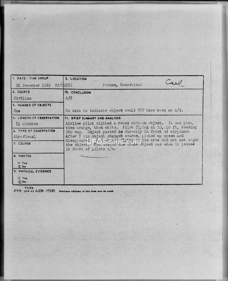 An airline pilot reported a round, color-changing object near Putnam, Connecticut, on December 22, 1965. The Air Force concluded there was no evidence to rule out the object being an aircraft.