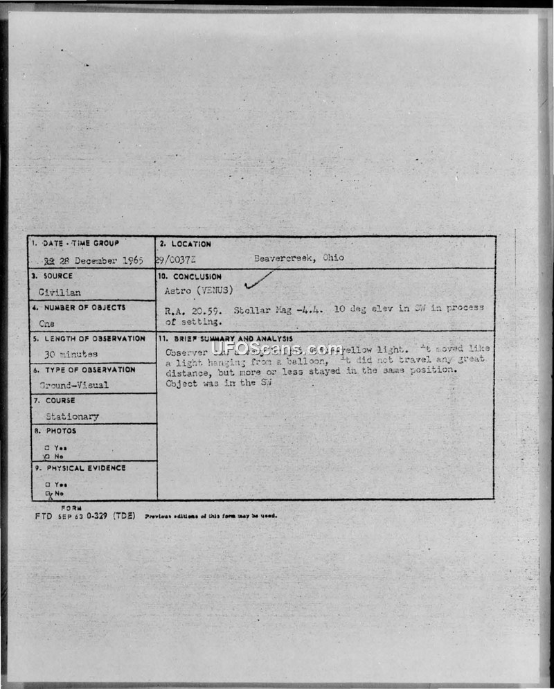 A student pilot reported a stationary, bright light in the sky over Beavercreek, Ohio, on December 28, 1965. The U.S. Air Force officially concluded the object was the planet Venus.