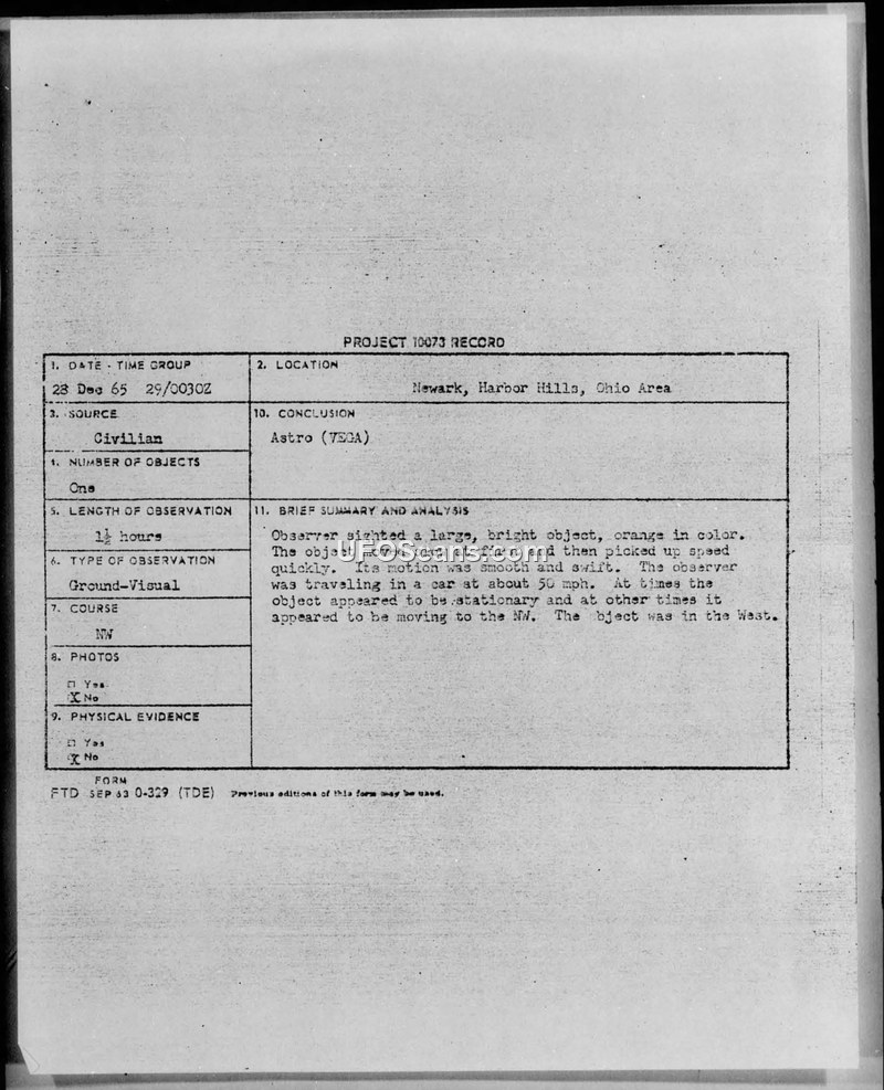 This document is a collection of official Air Force correspondence and a sighting report regarding an Unidentified Aerial Phenomenon (UAP) observed on December 28, 1965. The primary report details a sighting by a civilian couple traveling by car from Newark to Harbor Hills, Ohio. The observers reported a large, bright, round, orange object that appeared to move smoothly and swiftly, following the path of State Routes 440, 489, and 596, and crossing over U.S. Interstate Highway 70. The object was estimated to be 3 to 4 times larger than an airplane landing light and was observed at an altitude of 50 to 100 feet above the ground. The sighting lasted for approximately one and a half hours, during which the object appeared stationary at times and eventually turned white as it moved away. The report was processed by the 840th Combat Support Group at Lockbourne Air Force Base under the requirements of AFR 200-2. A weather report was requested and provided by Detachment 34 of the 3rd Weather Squadron to assist in the evaluation. The final conclusion provided in the Project 10073 record identifies the object as 'Astro (VEGA)'. The preparing officer, 2nd Lieutenant Christopher J. Hoppin, noted that while the observers were considered sincere and comprehensive, he could offer no further clues regarding the object's identity.