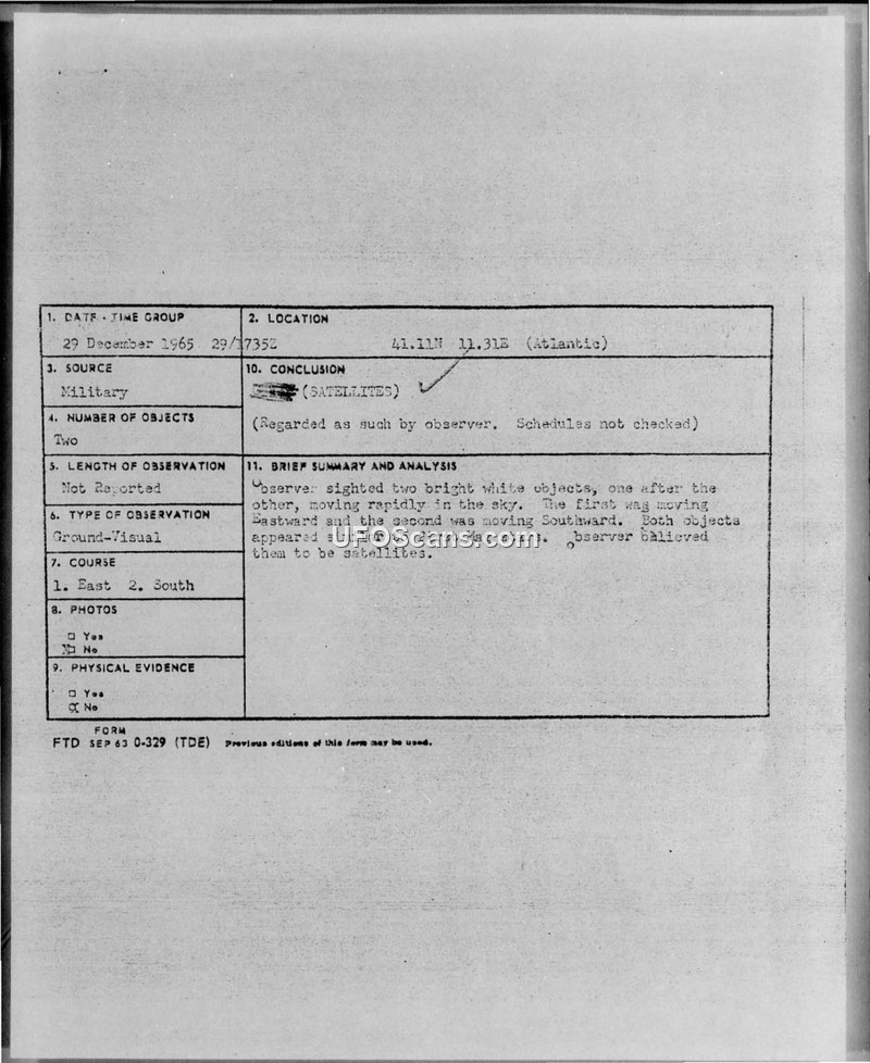 This document is a compilation of various reports, correspondence, and intelligence summaries regarding Unidentified Aerial Phenomena (UAP) from December 1965. The collection includes official military sighting reports, such as an incident on December 29, 1965, involving two bright white objects observed by the USS Rich in the Atlantic, which were suspected to be satellites. Additionally, the document contains correspondence from the Department of the Air Force to private citizens regarding Project Blue Book, providing brochures on the history of the UFO project. Several civilian reports are included, such as a sighting in Southampton, England, where witnesses described an oval-shaped object with fins, and a report from Tucuman, Argentina, regarding a landing in an alfalfa field that left a burned circle and a mysterious paper note. Another report from Florida describes a large, silvery, oval-shaped disk hovering near Lake Weir. The document also includes a summary of January 1966 sightings, which categorizes various events as meteors, stars, planets, or satellites, while noting several as unidentified. The overall tone of the documentation is administrative, focusing on the collection and categorization of reports for Project Blue Book, with many sightings being dismissed as astronomical phenomena or satellites, while others remain categorized as insufficient data or unidentified.