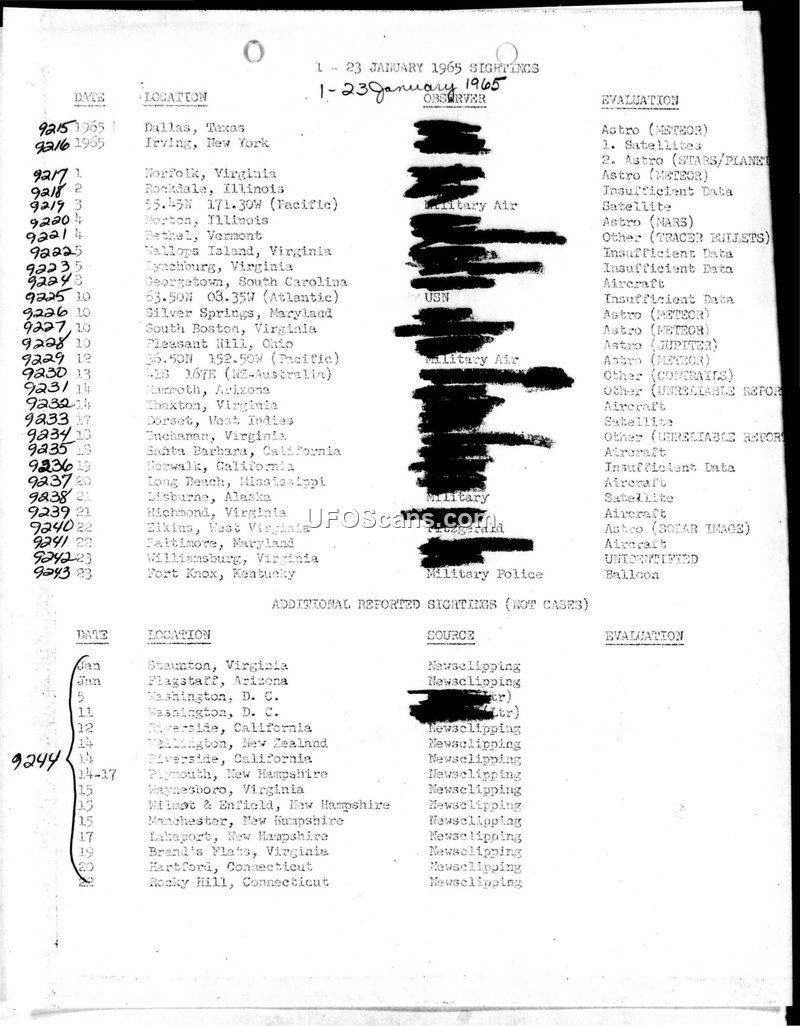 UAP Sighting Reports: January – December 1965