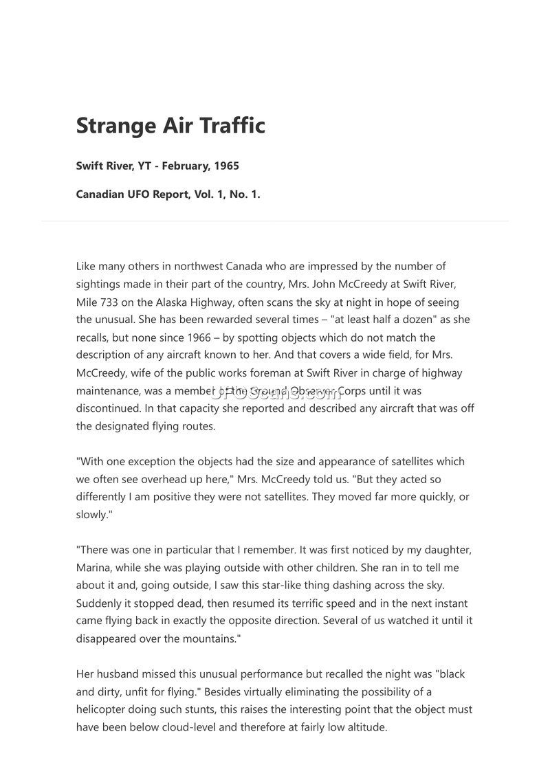 A series of UFO sightings in Swift River, Yukon, in 1965 involved multiple witnesses observing objects with anomalous flight characteristics. The sightings were concentrated near a strategic microwave tower and the Cassiar Mountains, leading to an unsuccessful local ground search.