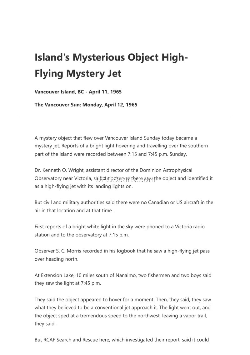 On April 11, 1965, reports emerged of a mysterious aerial object over Vancouver Island, British Columbia. Between 7:15 p.m. and 7:45 p.m., multiple witnesses observed a bright light in the sky. Dr. Kenneth O. Wright, assistant director of the Dominion Astrophysical Observatory, noted that an observer identified the object as a high-flying jet with landing lights activated. Another observer, S. C. Morris, recorded in his logbook that he witnessed a high-flying jet traveling north. Later, at 7:45 p.m., two fishermen and two boys near Extension Lake, south of Nanaimo, reported seeing the light hover before a second object, believed to be a conventional jet, approached it. Following this, the light extinguished, and the object departed to the northwest at a high rate of speed, leaving a vapor trail. Despite these reports, civil and military authorities, including the RCAF Search and Rescue, confirmed that no Canadian or US aircraft were operating in the vicinity at the time of the incident.