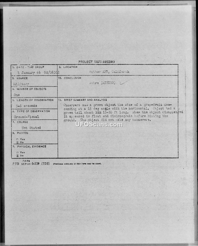 A sighting of a green, circular object with a tail was reported by two control tower operators at Mather AFB on 1 January 1966. The Air Force investigation concluded the object was a meteorite.