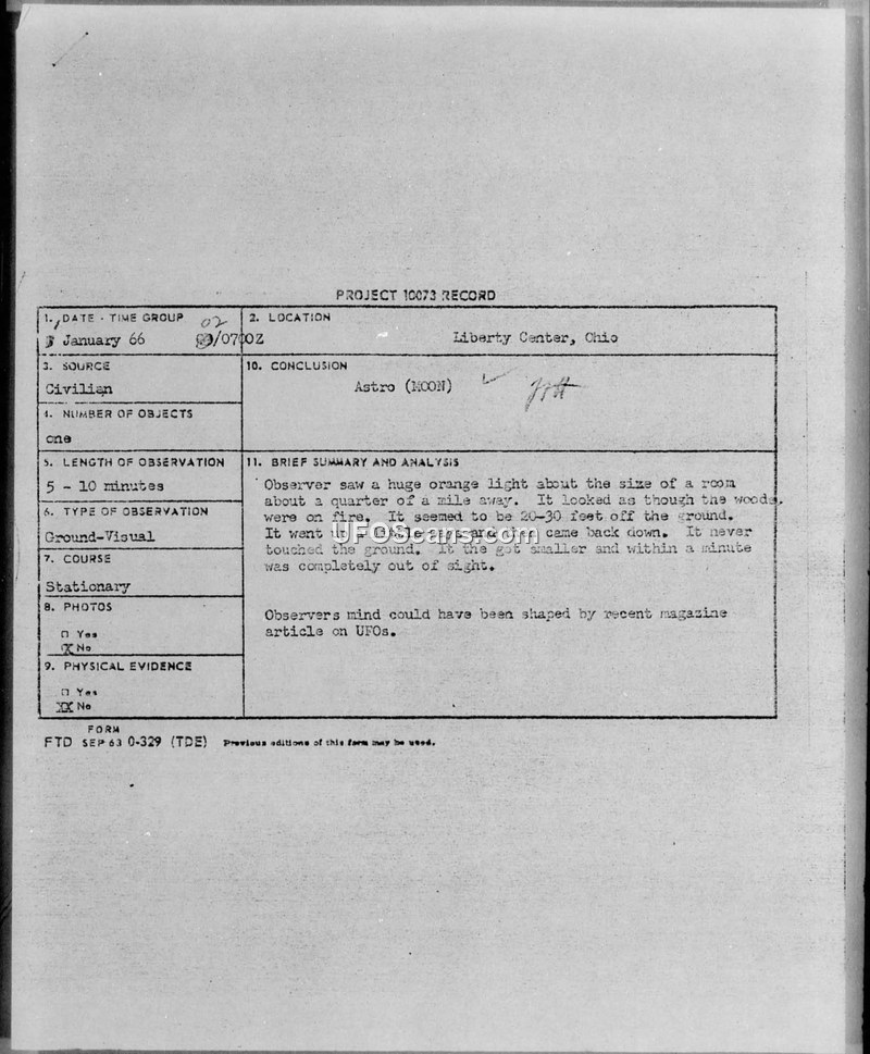 A civilian in Liberty Center, Ohio, reported a large orange light on 3 January 1966. Project Blue Book concluded the report was insufficient and suggested the witness was influenced by a recent Popular Science article.