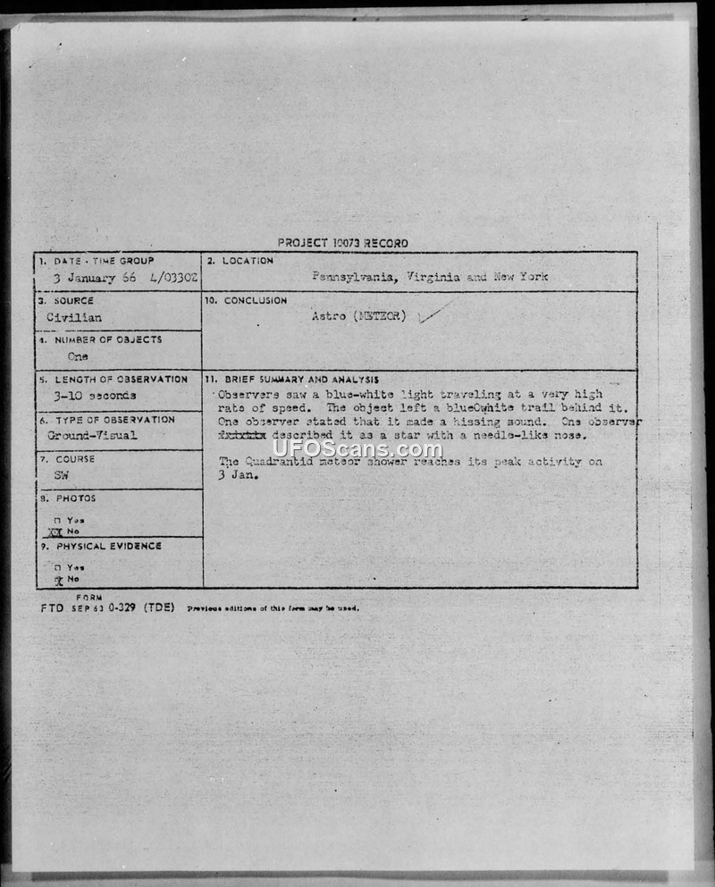 Project 10073 Record: UFO Sighting, 3 January 1966