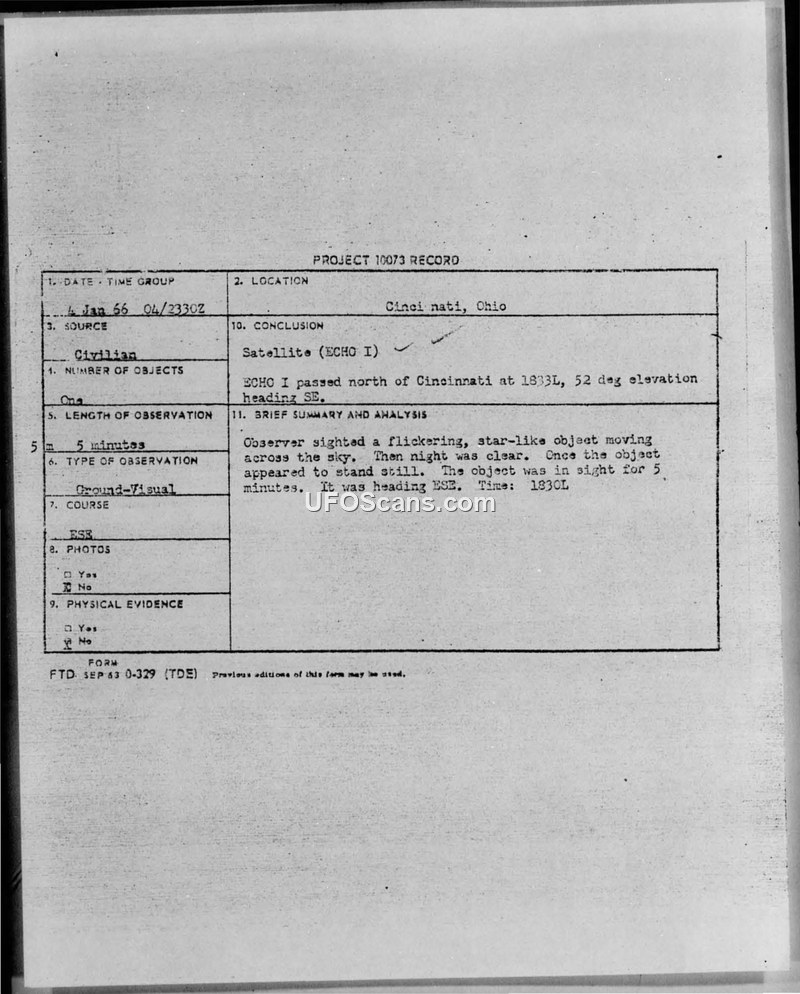 A civilian witness reported a star-like object in Cincinnati on January 4, 1966. The Air Force concluded the object was the ECHO I satellite.