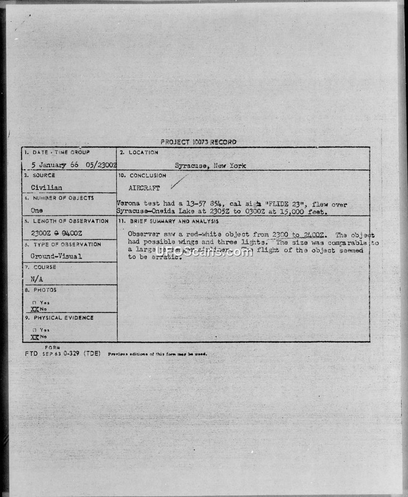 Project 10073 Record — Sighting Report, Syracuse, New York, 5 January 1966
