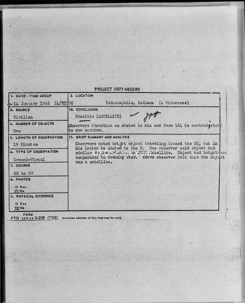Project 10073 Record — Sighting of 14 January 1966, Indianapolis, Indiana
