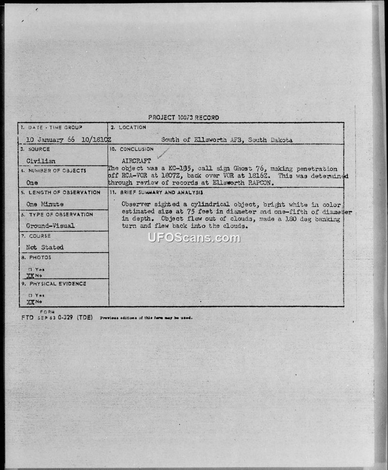 On 10 January 1966, at approximately 1810Z, a civilian inspector with the Base Civil Engineers at Ellsworth Air Force Base reported a sighting of an unidentified aerial object. The witness, a 64-year-old individual, observed a cylindrical object, described as bright white in color, with an estimated diameter of 75 feet and a depth of one-fifth of its diameter. The object was observed at an altitude of 8,000 feet for a duration of one minute. According to the report, the object emerged from clouds, performed a 180-degree banking turn, and subsequently returned into the clouds. The witness noted that bright flashes of light initially drew their attention to the object. Following the report, an investigation was conducted by the 821st Strategic Aerospace Division. By reviewing records from the Ellsworth RAPCON, officials determined that the object was actually a KC-135 aircraft, identified by the call sign Ghost 76. The aircraft was documented as making a penetration off the RCA-VOR at 1807Z and returning over the VOR at 1816Z, which aligned with the timing of the sighting. The report concludes that the object was identified as this specific military aircraft.