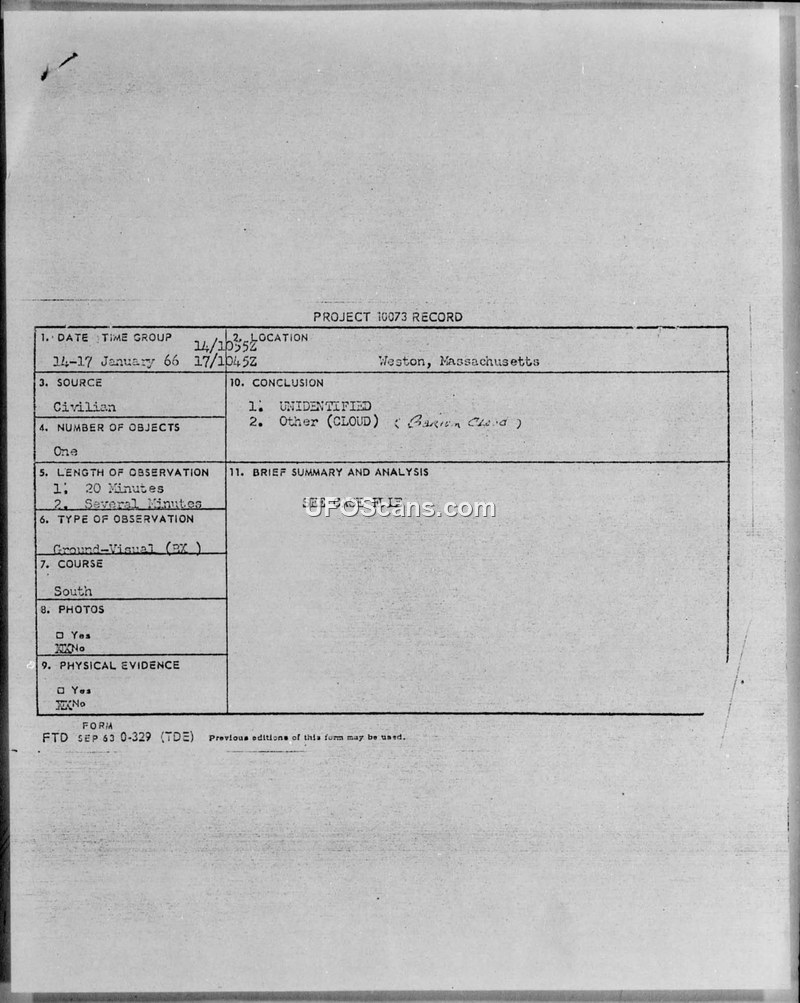 Project 10073 Record: Weston, Massachusetts Sightings, January 1966
