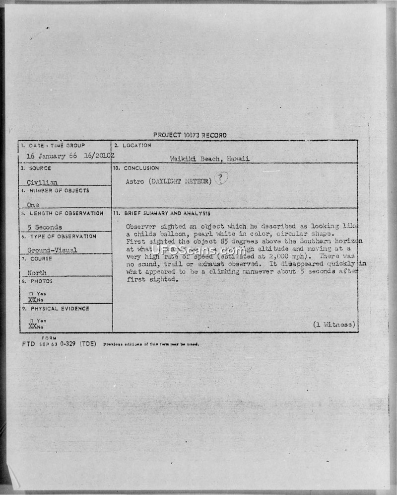 Project 10073 Record — Waikiki Beach, Hawaii, 16 January 1966